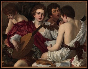 Fra le opere giovanili di Caravaggio, quando poco più che ventenne il pittore si stabilì a Roma, ricordo un quadro molto intrigante di non grandi dimensioni (92X118 cm). Oggi la tela intitolata “Concerto di giovani”, o “I musici”, è conservata al Metropolitan Museum di New York. L’opera è ricordata dallo storico del Seicento Cesare Baglione che scrisse: “Il Merisi dipinse per il Cardinale Del Monte una musica di alcuni giovani ritratti al naturale, assai bene”.