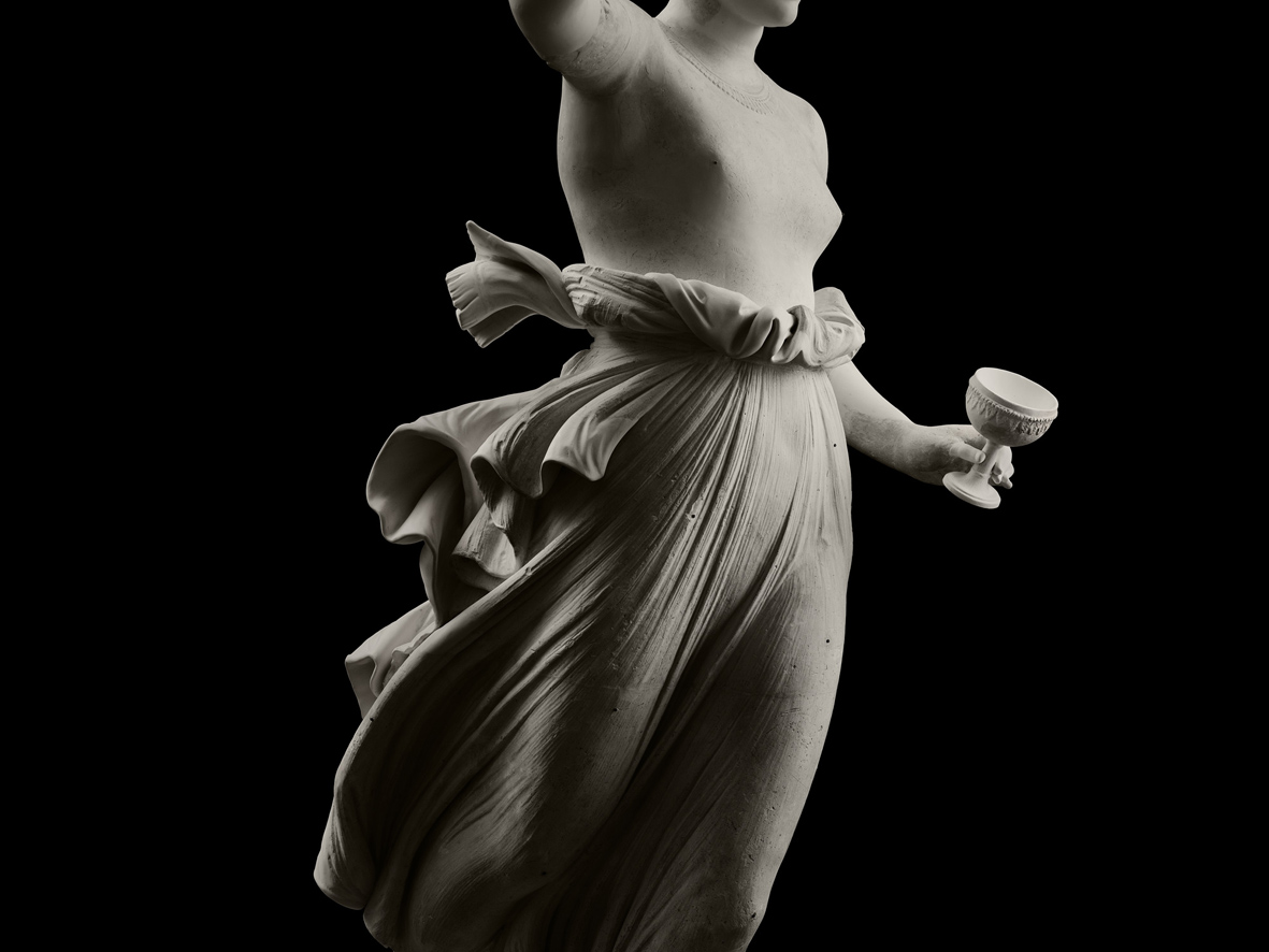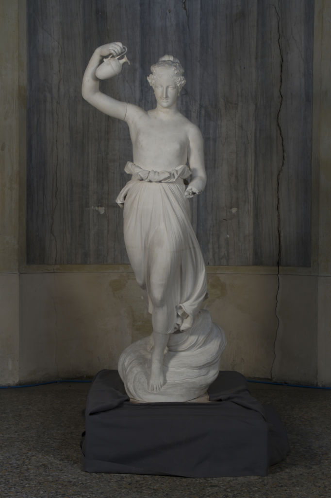 Sfuggente ma al contempo intrigante, il mito di Ebe ha conosciuto, attraverso i secoli, un’alterna fortuna nella cultura occidentale. Citata da Omero e da Esiodo, a Ebe, figlia di Zeus e di Era, spettava il ruolo di enofora, l’ancella delle divinità. Il misterioso nettare che mesceva donava l’immortalità e l’eterna giovinezza. Dopo il matrimonio con Eracle, il suo ruolo di coppiera degli dèi fu assegnato a Ganimede. Profondo conoscitore del classico, nutrito della cultura antiquaria che nel Settecento rinveniva e classificava con dedizione i preziosi reperti antichi, Canova seppe condensare il mito di questa divinità adolescente in un’immagine emblematica, quella della gioventù colta all’apice della sua fiorente bellezza, in quel fugace momento di perfezione che anticipa l’età adulta. Ne realizzò due differenti versioni. La prima, in cui la giovane dea, che si appresta a mescere l’ambrosia, atterra su una spumosa nuvola; l’altra, colta mentre appoggia leggiadramente i piedi alla base di un tronco d’albero. Entrambe le versioni, trasposte in marmo, sono il vanto di quattro importanti collezioni pubbliche e private d’Europa: dagli Staatlichen Museen di Berlino all’Ermitage di San Pietroburgo, dalla Collezione Devonshire a Chatsworth ai Musei di San Domenico di Forlì.