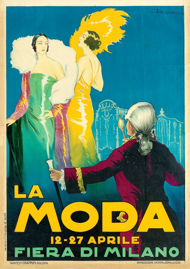 E proprio la fedeltà della clientela è uno dei crucci dei nuovi imprenditori, perché tra grandi magazzini la concorrenza è serrata: accuse di imitazione, ricerca di slogan a effetto, creazione, produzione e utilizzo di ogni strumento promozionale, dai manifesti, ai cataloghi illustrati, alle cartoline, ai depliant, alle inserzioni sui giornali. Ogni esercizio commerciale studia la propria strategia promozionale e la declina sui diversi mezzi di comunicazione dove propone quanto artisti e illustratori ideavano, interpretando i linguaggi del costume e della società italiana in un periodo di creatività senza precedenti. La moda in scena alla Villa dei Capolavori – Nei saloni contigui a quelli che ospitano permanentemente opere capitali di Tiziano, Dürer, Van Dyck, Goya, Canova, Renoir, Monet, Cézanne, Morandi e molti altri, la Fondazione Magnani-Rocca – la celebre Villa dei Capolavori a Mamiano di Traversetolo, presso Parma – dal 10 settembre all’11 dicembre 2022 viene illustrata la nascita della moda italiana, grazie agli strumenti di comunicazione che l’hanno supportata, dai manifesti alle riviste, ai cataloghi dei grandi magazzini, in un arco cronologico che inizia nell’Ottocento e prosegue fino a metà Novecento. Di grande importanza è il ruolo del cinema nello sviluppo e comunicazione della moda sin dal suo avvento, ricostruito all’interno dell’esposizione e nel catalogo.