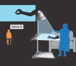 Eugenio nasce dall’idea di favorire l’interazione tra nonno e nipote, considerando sia le esigenze generazionali sia quelle culturali. Prevediamo infatti che nel futuro la società sarà più anziana ed etnicamente mista e quindi la lingua e la comunicazione saranno gli aspetti fondamentali sui quali ci si focalizzerà. Eugenio è una lampada da terra progettata per la proiezione di luci, colori e immagini. Nella modalità base, il prodotto segnala l’ora, la data, la temperatura, funge da amplificatore vocale e ricarica la batteria in modo wirless a induzione per dispositivi quali cellulari, tablet ecc.. Inoltre svolge tutte le funzioni di un normale tavolino pensato per agevolare le attività legate al divano come leggere, riposare, cucire.. La lampada permette di scegliere e regolare la tipologia di luce da spot a di°usa, l‘intensità luminosa e la cromia per ricreare, ad esempio, situazioni rilassanti ed emotivamente coinvolgenti. Inoltre, tramite Eugy, un proiettore separato, si possono ingrandire foto, film, documenti da proiettare a parete per essere visualizzati meglio. Per quanto riguarda l’interazione con il bambino, la nonna comunica utilizzando Eugenio per creare ombre e favole di luce. In un primo step, essi creano assieme questi giochi direttamente sul tavolino e il nipote entra così nella fase della scoperta e della conoscenza.