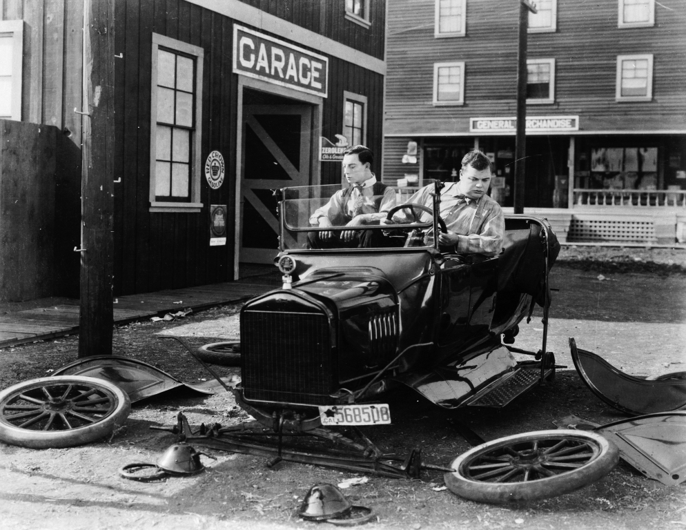 Il passaggio di Keaton al cinema risale al 1917, a New York, sotto l’egida di una star delle commedie a due rulli (ossia della durata di circa 20 minuti) conosciuto casualmente tramite un amico comune: Roscoe “Fatty” Arbuckle. Reduce dalla recente rottura con Mack Sennett, Arbuckle si era messo in proprio, fondando una sua compagnia, e cercava nuovi attori da affiancare a se stesso e al nipote, Al St John (nome d’arte “Slim”). La prima apparizione sullo schermo di Keaton avviene nel film The Butcher Boy (1917) con Arbuckle e St John. Il suo personaggio è già connotato da impassibilità e serietà nonché dal minuscolo cappello piatto che lo accompagnerà per tutta la vita artistica. Con Arbuckle, Keaton forma in breve la classica “strana coppia” di molto cinema americano comico. Grasso, imponente, ridanciano e smorfieggiante l’uno, smilzo, dinoccolato e serio l’altro. Il mix funziona e Keaton si ritrova così a scrivere anche brevi soggetti per le slapstick, (lett. sberla e bastone) ossia per le “comiche” basate su serie di gag con inseguimenti, capriole, scazzottate e altre forme di comicità fisica. A parte una breve parentesi bellica nel 1918, la collaborazione tra i due prosegue per circa due anni, con una dozzina di film, e serve a Keaton anche per apprendere i rudimenti della regia e della produzione. Con il nuovo decennio i due si separano: nel 1920 Keaton fonda una propria compagnia e, nel 1921, Arbuckle incorre in uno scandalo che, all’apice della carriera, lo estromette per sempre dal mondo dello spettacolo. Per festeggiare un nuovo contratto che lo pone al secondo posto, subito dopo Chaplin, tra gli attori più pagati, Arbuckle dà una festa in un hotel che si conclude con il ricovero in ospedale di un’attricetta che lo accusa di stupro. La ragazza muore alcuni giorni dopo in seguito ai traumi subiti. Ne seguono svariati processi al termine dei quali Arbuckle esce scagionato dall’accusa di omicidio, ma la sua carriera è finita per sempre. Nel corso della lunga vicenda giudiziaria Keaton è l’unica star di Hollywood a prendere pubblicamente posizione a favore dell’amico.