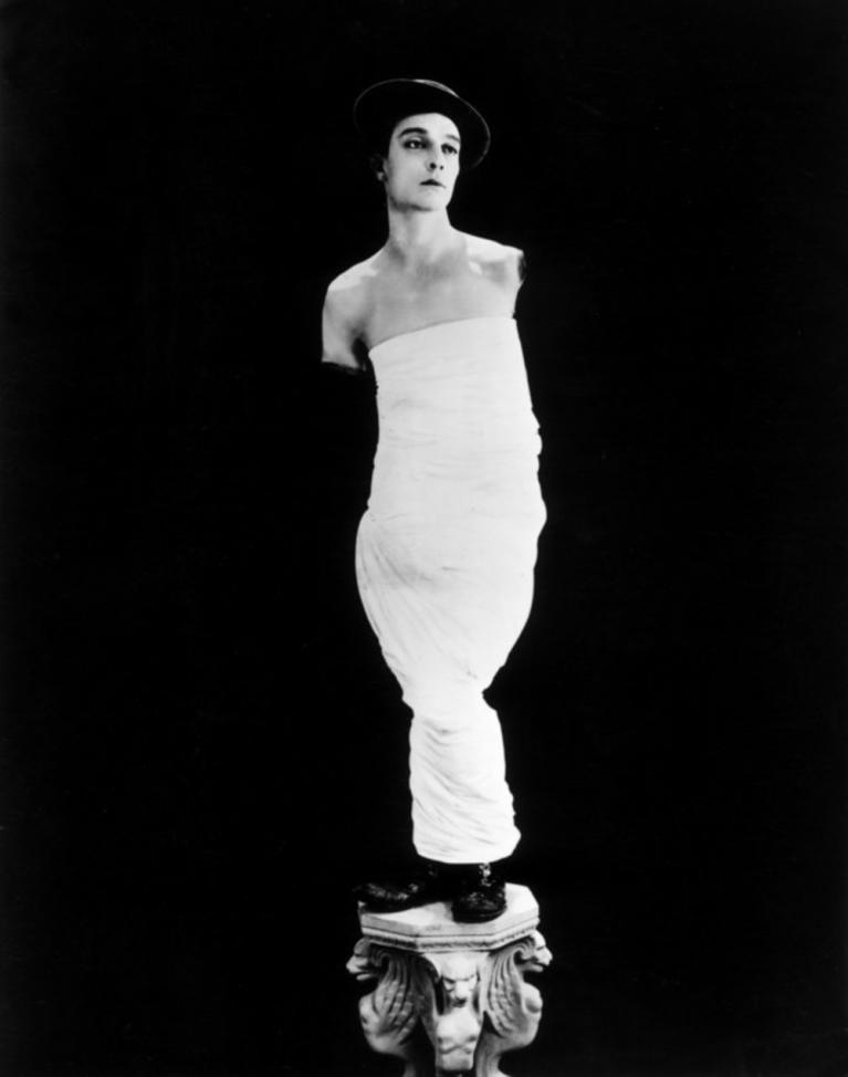 Agosto 1953. Al teatro Manzoni è in scena la rivista “Il piccolo naviglio”, tratta da un programma radiofonico, scritta da Silvia e Terzoli (anche registi), Scarnicci, Tarabusi, Simonetta, Zucconi e dal giornalista Orio Vergani. Protagonisti sono i milanesi Fausto Tommei, Elena Borgo e un trio comico composto dal giovane (e ancora magrissimo) Gino Bramieri, Ettore Conti e Gianni Cajafa. Gli spettatori sono in maniche di camicia per l’afa (l’aria condizionata è di là da venire) si sventolano con il giornale o con il ventaglio assistendo ai soliti numeri di varietà con soubrette più o meno svestite, freddure, doppi sensi e qualche innocua battuta di polemica politica. Una sera, a sorpresa, la rivista ha una virata improvvisa. Un numero annunciato all’ultimo momento fa il pieno in platea soprattutto di tutti gli intellettuali milanesi rimasti in città. È lo sketch di un anziano signore che fa di tutto per mettere a letto la giovane moglie. Una pantomima di sei minuti e mezzo capace di far calare in sala un religioso silenzio. L’atmosfera, intensa ed emozionante, è più che giustificata. L’artista altri non è che il grande Buster Keaton, il mitico “faccia di pietra” in carne e ossa, ormai in declino e costretto a esibirsi nelle riviste.