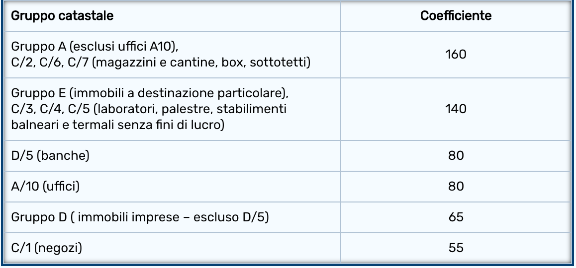 Non cambia nulla per il pagamento: si calcola partendo dalla rendita catastale rivalutata del 5%, alla quale si applica un coefficiente che dipende dalla categoria catastale: