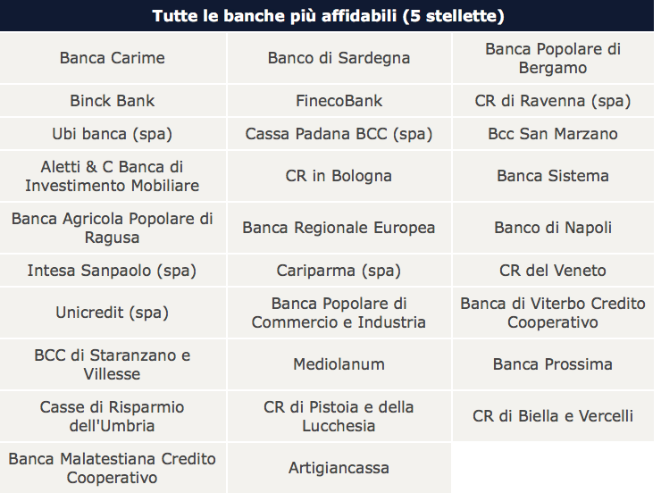 Altroconsumo Finanza ha analizzato l’affidabilità di 291 banche (con almeno 10 sportelli) dando un punteggio da 5 a 1 stella: 5 stelle indicano le banche più affidabili a scendere fino a 1 stella.