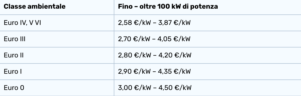 L’importo del bollo auto varia in base alla potenza del veicolo: bisogna moltiplicare i kW del proprio mezzo (indicati sul libretto di circolazione) per i valori in tabella (per classe Euro 6, Euro 5, Euro 4 o inferiore) aggiungendo l’addizionale IRPEF regionale.