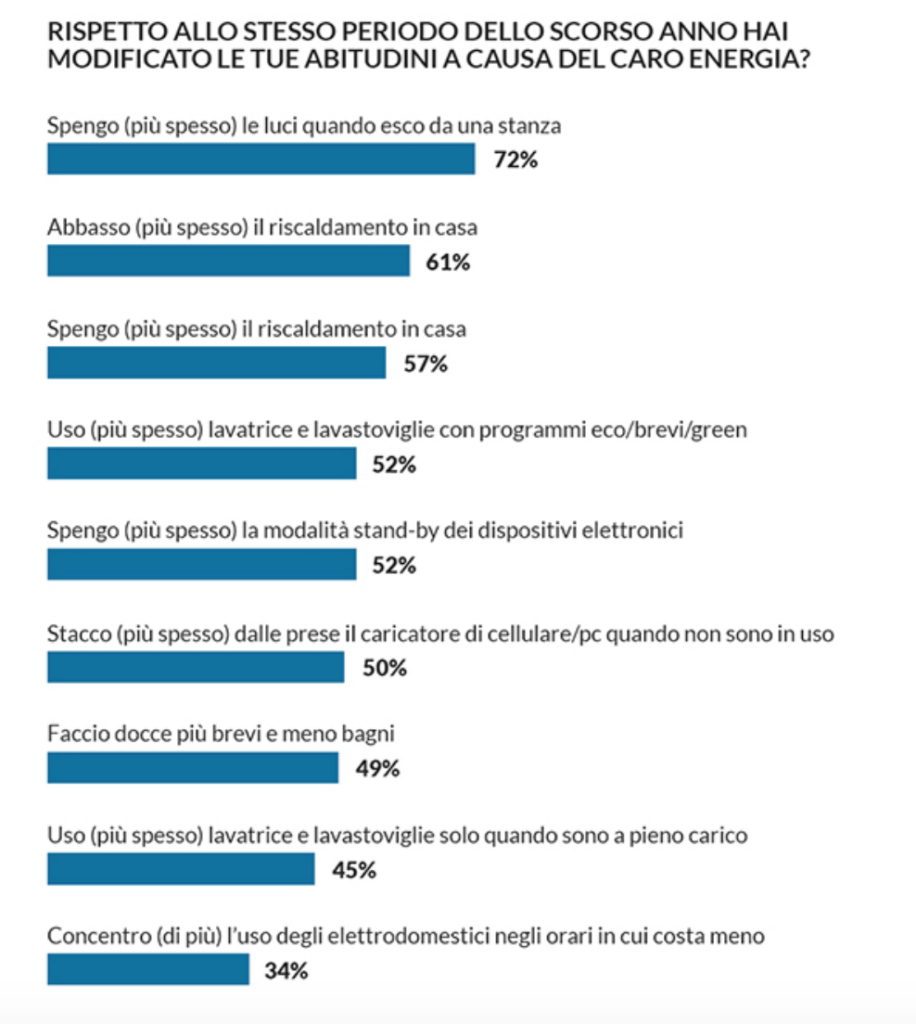 Nell’incertezza generale che caratterizza lo scenario attuale, emerge un piccolo spiraglio di luce: gli italiani infatti dimostrano una maggiore consapevolezza nel seguire comportamenti anti-spreco, come ridurre il riscaldamento in casa, utilizzare gli elettrodomestici a pieno carico e con programmi eco. Il 72% degli intervistati ritiene di essere più informato su questi temi e il 68% afferma di voler continuare in questo senso, anche quando l’emergenza energetica sarà terminata.Inoltre, il 44% dei consumatori ha preso almeno un’iniziativa per migliorare il risparmio energetico in casa, come installare pompe di calore o pannelli solari.