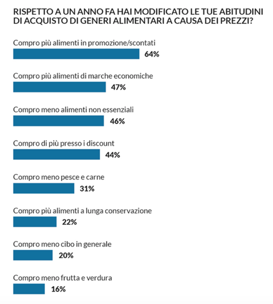 È preoccupante che molte famiglie in difficoltà non riescano a onorare spese di prima necessità quali le bollette; infatti, per il 42% degli italiani è diventato praticamente un costo insostenibile. Cambiano drasticamente le abitudini legate all’acquisto di cibo, il 20% delle persone compra meno prodotti alimentari: in particolar modo il 31% acquista meno carne e pesce, mentre il 16% riduce il consumo di frutta e verdura.