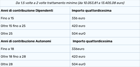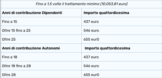 Per il diritto alla quattordicesima pensione, viene considerata tutta la contribuzione accreditata. Per le pensioni in totalizzazione e cumulo, però, viene calcolata la sola contribuzione degli enti pubblici (INPS-ENPALS-INPDAP-IPOST-INPGI) e viene esclusa quella preso gli enti privatizzati. Per la pensione ai superstiti, l’anzianità contributiva è rapportata all’aliquota spettante. Coloro che non ricevono la quattordicesima ma pensano di averne diritto, possono, fare domanda di ricostituzione online, ai fini dell’ottenimento del beneficio. La quattordicesima viene riconosciuta in via provvisoria in base ai redditi presunti, e viene verificata successivamente, a consuntivo, sulla base dei redditi effettivi. In caso di prima concessione della quattordicesima, la verifica del diritto viene effettuata sulla base di tutti redditi annui del soggetto richiedente che, in relazione agli anni di contribuzione, deve essere inferiore ai limiti indicati nella seguente tabella (limiti reddituali dell’anno).