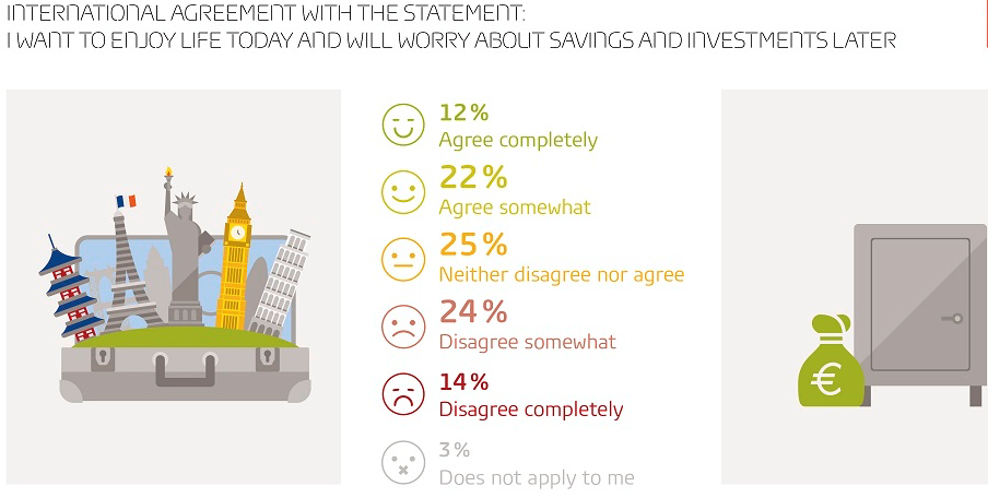 Circa il 40% delle donne intervistate a livello internazionale si è dichiarato in disaccordo con l’ idea di godersi la vita oggi per pensare al risparmio domani (circa il 33% è invece d’ accordo). Più frammentata la situazione tra gli uomini, che sono più equamente divisi con il 36% di persone d’accordo e il 35% in disaccordo.