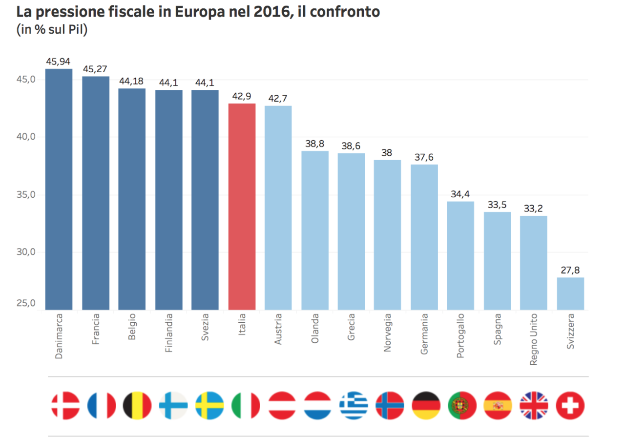 Il fenomeno è antico. Lo aveva denunciato l’allora governatore della Banca d’Italia, Mario Draghi, già nel 2007: il livello della pressione fiscale italiana «è più alto della media europea». «A causa del peso dell’evasione — aveva spiegato nelle Considerazioni finali — la differenza tra l’Italia e il resto d’ Europa è maggiore se si guarda al prelievo sui contribuenti fiscalmente onesti». Insomma, paghiamo troppe tasse anche perché da noi si evade di più. Ma c’è chi non è d’accordo e sostiene che non bisogna scambiare le cause con gli effetti e che quindi è tutta colpa dello Stato che in Italia chiede troppo costringendo i contribuenti ad evadere. Ma è proprio così? Secondo l’ultimo rapporto Ocse, l’Italia è al sesto posto nella classifica della pressione fiscale in rapporto al Pil, col 42,9%. Al primo posto c’è la Danimarca col 45,94%, davanti a Francia (45,27%), Belgio (44,18%) e Finlandia e Svezia, entrambe al 44,1%. Eppure in questi Paesi l’evasione fiscale è più bassa che da noi.