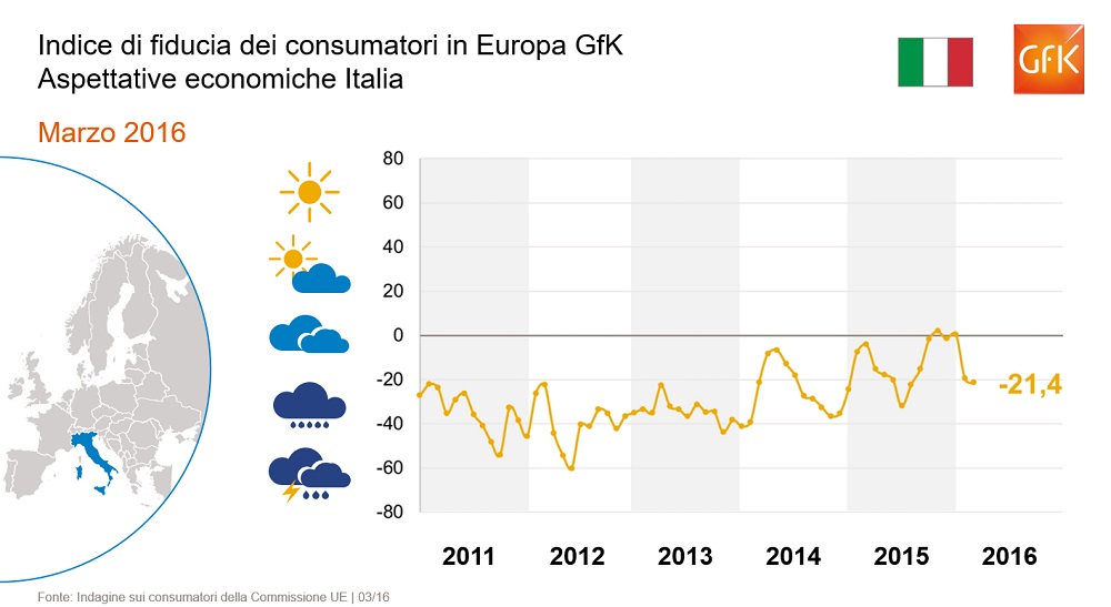 Il trend positivo registrato negli ultimi mesi del 2015, con un indice di fiducia dei consumatori italiani salito – per la prima volta dal 2010 – di 1,9 punti, sembra appartenere al passato. Secondo quanto emerge dai risultati dell’indice di fiducia dei consumatori in Europa, rilevato da GfK, nei primi tre mesi del 2016 l’indicatore relativo al nostro Paese è nuovamente sceso in area negativa, attestandosi a -21,4 punti; un calo che si traduce in un indice negativo di 20 punti rispetto allo scorso dicembre.