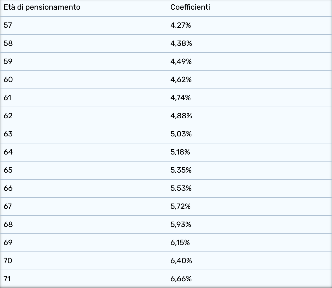 Oltre al montante contributivo dell’intera propria vita lavorativa – che si può ottenere facendo domanda all’INPS dell’Estratto Conto Certificativo (EcoCert) – ed alla presunta età della pensione – in base alla formula prescelta, ossia 67 anni per quella di vecchiaia o anche prima per quella anticipata o con le varie formule agevolate (APE Sociale, Opzione Donna, Quota 102, Pensione Precoci, Pensione Usuranti, ecc.) – è necessario conoscere i coefficienti di trasformazione per le pensioni da applicare nel proprio caso. Il calcolo della pensione finale si ottiene moltiplicando il montante contributivo (la somma di tutti i contributi versati dal lavoratore nel corso della carriera lavorativa) per il coefficiente di trasformazione relativo all’età in cui si va in pensione (conteggiando anche le frazioni d’anno).