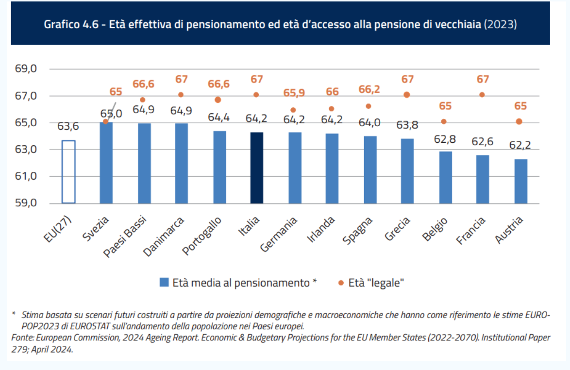 L’età media del pensionamento è 64,6 anni, e pur essendo ancora considerato troppo basso per la sostenibilità dell sistema è migliorata dal 2021, quando era pari a 62,1 anni.
