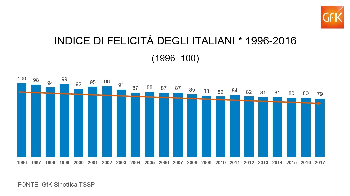Negli ultimi 20 anni, l’indice di felicità degli italiani è calato di oltre 20 punti, con un trend quasi sempre negativo. Secondo quanto emerge dai dati GfK Sinottica TSSP, il 18% degli italiani è soddisfatto della propria vita, il 15% dichiara di non essere soddisfatto, mentre il restante 67% non è né soddisfatto né insoddisfatto.