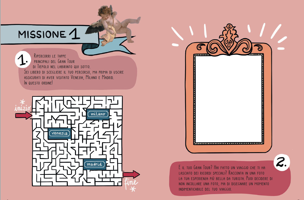 “In missione con… Tiepolo” è un viaggio avventuroso attraverso la vita e l’arte di Giambattista Tiepolo, un viaggio che possiamo far fare ai bambini leggendo il libro o ascoltando l’audiolibro. Nelle pagine si susseguono tantissimi giochi e attività divertenti che ogni bambino può svolgere da solo o con il nostro aiuto. I piccoli lettori dovranno affrontare molte missioni e lasciare che la creatività si scateni. Non ci sono regole né risposte giuste o sbagliate, solo molte possibilità di imparare, essere creativi e divertirsi. Proviamo a testare la prima esperienza? Ecco qua; divertitevi per primi voi!