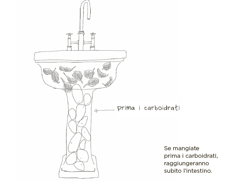 Anche l’ordine in cui assumiamo i cibi ha un effetto potente sulla curva del glucosio. Ma qual è l’ordine giusto? Prima le fibre, poi le proteine e i grassi, per ultimi amido e zuccheri. Secondo i ricercatori, gli effetti di questo accorgimento sono paragonabili a quelli dei farmaci per il diabete prescritti per abbassare i picchi glicemici. Un sorprendente studio del 2016 ha confermato queste scoperte: due gruppi di diabetici di tipo 2 hanno seguito una dieta identica per otto settimane, ma un gruppo poteva mangiare gli alimenti nell’ordine che desiderava, l’altro doveva farlo secondo uno schema preciso. Il secondo gruppo ha riportato una significativa riduzione del livello di HbA1c; significa che il diabete di tipo 2 stava iniziando a regredire. L’altro gruppo, che ha consumato gli stessi cibi con il medesimo apporto calorico ma senza rispettare un ordine prestabilito, non ha riscontrato miglioramenti. È una scoperta sensazionale. Il motivo per cui questo accade ha a che fare con il funzio-namento dell’apparato digerente. Per visualizzarlo, pensate allo stomaco come a un lavandino e all’intestino tenue come al tubo sottostante. Tutto quello che mangiamo finisce nel lavandino, poi scorre attraverso il tubo, dove viene scomposto e assorbito dal sangue. Ogni minuto, durante la digestione, una quantità di cibo equivalente a circa tre calorie passa dal lavandino al tubo.(Questo processo si chiama svuotamento gastrico.)