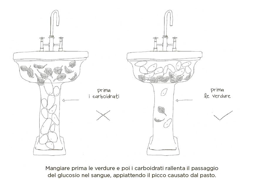 Se l’amido o gli zuccheri entrano nello stomaco per primi, passano in fretta nell’intestino. Qui sono scomposti in mole-cole di glucosio che raggiungono altrettanto in fretta il flusso sanguigno, dando origine a un picco. Più carboidrati mangia-mo e più velocemente li mangiamo, maggiore è l’impatto del glucosio e più elevato il picco glicemico. Se sul piatto avete pasta e verdure (per esempio, i brocco-li, che io adoro) e mangiate prima la pasta e poi i broccoli, la pasta, che è ricca di amido, sarà digerita rapidamente e trasfor-mata in glucosio. I broccoli, invece, dovranno «attendere il loro turno» prima di passare dal lavandino al tubo. Invece, se consumate prima le verdure e poi i carboidrati, ciò che accade è diverso. Iniziate dai broccoli: si tratta di verdure che contengono molta fibra.