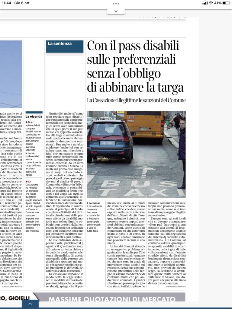 Dunque sono gli enti locali che si devono organizzare: “Non può frapporsi alcun ostacolo alla libertà di locomozione del soggetto disabile fondato sull’inadeguatezza del sistema di controllo automatizzato”. E’ il Comune, al contrario, a dover “predisporre apposite modalità di accertamento, nella logica di leale collaborazione con l’utente stradale affetto da disabilità legalmente riconosciuta, senza, però, imporre a quest’ultimo oneri e obblighi ulteriori”, non previsti da alcuna legge: La decisione se annullare quelle multe tornerà al Tribunale di Milano, che dovrà però adeguarsi alla linea dettata dalla Cassazione