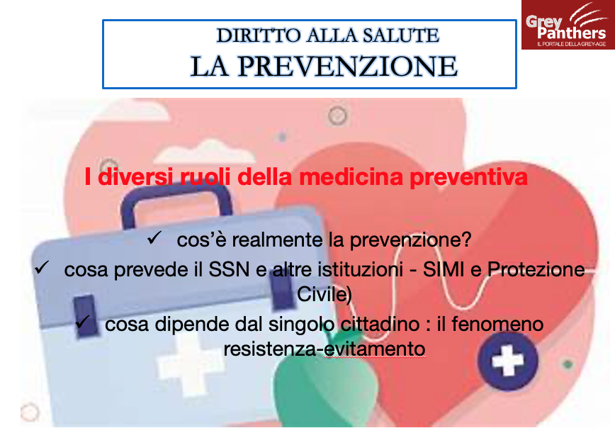 La prima slide riguarda I DIVERSI RUOLI DELLA MEDICINA PREVENTIVA, dedicata alla definizione di prevenzione partendo dal concetto che il modo migliore di stare bene è prendersi cura della salute. Si evidenzia cosa prevede il SSN in alcuni articoli dedicati e il ruolo di istituzioni correlate quali il SIMI, Sistema Informatico Malattie Infettive (1990) e la Protezione Civile (1992). In contrapposizione, si evidenzia il ruolo del cittadino nel mantenere il proprio stato di salute e anche nell’evitare e/o rallentare l’aggravamento. È il “dovere di mantenere la salute individuale” che salvaguardia la sostenibilità del SSN stesso. Quindi avere consapevolezza dei corretti stili di vita, alimentazione, dipendenze, esercizio fisico, tutela del sonno e della capacità cognitiva, gli screening, le vaccinazioni e gli inquinanti ambientali.