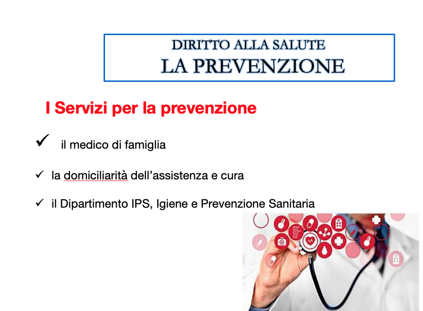 La seconda riguarda I SERVIZI PER LA PREVENZIONE: si esamina il contributo del medico di famiglia secondo il concetto di Silvio Garattini , scienziato e fondatore presidente dell’Istituto di ricerca farmacologica Mario Negri, che “ la malattia è un fallimento”. Altro elemento è conoscere tutte le potenzialità della domiciliarità ovvero dell’assistenza e cura delle persone al proprio domicilio, nella rete delle relazioni sociali e dei servizi territoriali che lo stesso medico di famiglia deve saper raccomandare in modo idoneo. I servizi collettivi a favore di un’efficiente ed efficace prevenzione sono, invece, di competenza dei Dipartimento IPS, Igiene e Prevenzione Sanitaria. Si declinano le varie voci in ambiti molto diversi del mondo del lavoro, della scuola, della ristorazione domestica e collettiva, degli esercizi commerciali e della tenuta degli animali.