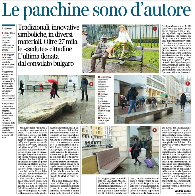 Ma al di là del recente fenomeno dell’omaggio o del messaggio simbolico, Milano è una città con tantissime panchine pubbliche. L’ultima stima parla di più di 27 mila. La maggior parte sono realizzate sul «modello Milano». Quelle verdi, che sono in larghissima maggioranza, si trovano essenzialmente nei parchi e giardini e sono composte di 16 listelli, lunghi 1.95 metri, in pino svedese verniciato e comprensivo di supporti zincati. Le produce un consorzio (Manutenzione Integrata Ambientale Milano) che si rifornisce soprattutto nella zona della Bergamasca. Ogni panchina «modello Milano» costa 120 euro. Ci sono anche esemplari più di pregiati. Quelle in legno Doussiè, per esempio, che costano più di 250 euro e si trovano nelle aree di particolare rilievo artistico (ad esempio in largo Ghiringhelli, a fianco della Scala). Ancora più lussuose (800 euro) sono quelle in legno marrone scuro a 5 listoni grossi con supporti in acciaio. Si trovano in via Sarpi, a Gambara e in De Angeli e arriveranno in Sant’Agostino e piazzale Archinto. In centro ci sono anche più di 700 esemplari di panchine in pietra naturale (in corso Vittorio Emanuele, per dire di una installazzione-simbolo), mentre il modello extra-luxe è quello in granito di montorfano senza schienale. Costo: mille euro a panchina. Non più d’una ventina gli esemplari cittadini, tra cui le sedute di fronte al Museo del Novecento.