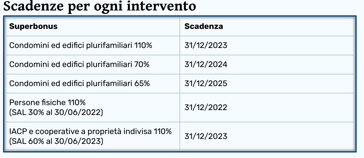 - Infine, con modifica introdotta nel corso dell’iter parlamentare, per gli IAAP (istituti autonomi case popolari) e le cooperative di abitazione a proprietà indivisa, proroga al 2023 a condizione che entro il 30 giugno 2022 sia stato effettuato almeno il 60 per cento dei lavori.