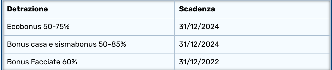 - Per gli interventi effettuati nei comuni dei territori colpiti da eventi sismici verificatisi a far data dal 1° aprile 2009 dove sia stato dichiarato lo stato di emergenza, la detrazione è al 110% per le spese sostenute entro il 31 dicembre 2025.