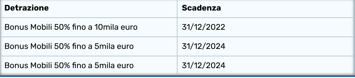- Bonus Mobili: al 50% fino a un tetto di spesa di 10mila euro nel 2022 e 5mila euro nel 2023 e 2024, dal 2022 i grandi elettrodomestici devono essere almeno di classe A per forni, classe E per lavatrici, lavasciugatrici e lavastoviglie, classe F per frigoriferi e congelatori.