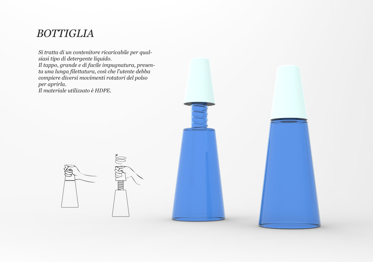 BOTTIGLIA: Si tratta di un contenitore ricaricabile per qualsiasi tipo di detergente liquido. Il tappo, grande e di facile impugnatura, presenta una lunga filettatura, così che l’utente debba compiere diversi movimenti rotatori del polso per aprirla. Il materiale utilizzato è HDPE.