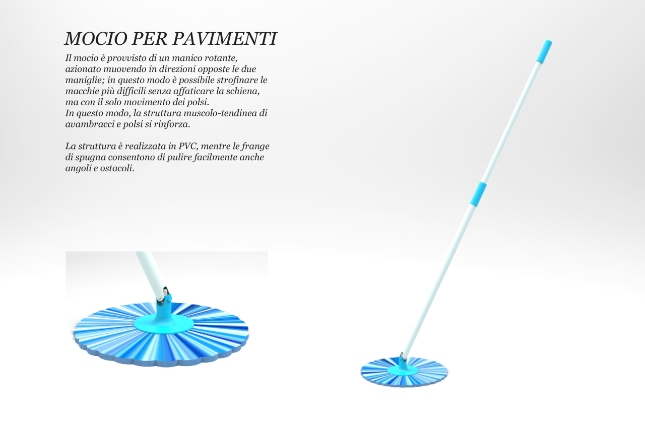 MOCIO: Il mocio è provvisto di un manico rotante, azionato muovendo in direzioni opposte le due maniglie; in questo modo è possibile strofinare le macchie più difficili senza affaticare la schiena, ma con il solo movimento dei polsi. In questo modo, la struttura muscolo-tendinea di avambracci e polsi si rinforza. La struttura è realizzata in PVC, mentre le frange di spugna consentono di pulire facilmente anche angoli e ostacoli.