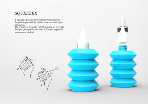 SQUEEZER L’oggetto è pensato per indirizzare il detergente lungo le fughe delle piastrelle, dove lo sporco è più insistente. Per erogare il prodotto, l’utente compie un esercizio benefico per i pollici, che sono le dita più colpite da patologie articolari.