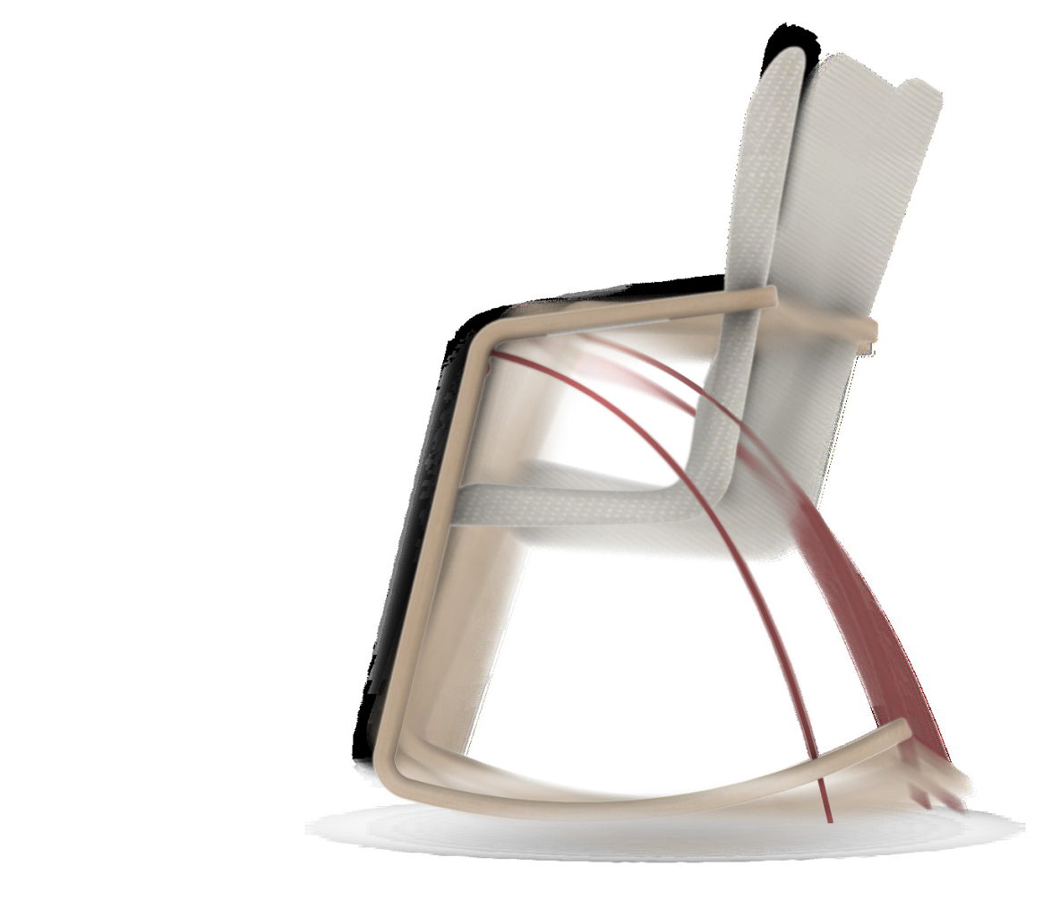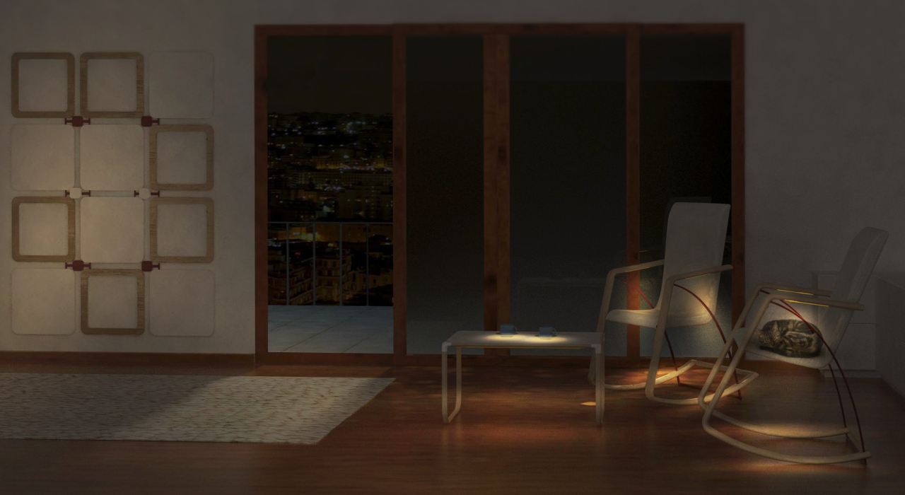 Così i progettisti presentano il loro lavoro: In una società piena di stimoli è necessario ritrovare il tempo del sé. Rituali, percorsi ed emozioni entrano nelle mura domestiche caratterizzando gli ambienti e personificando gli oggetti del vivere quotidiano.Temperatura, luce ed esperienza di deprivazione sensoriale conducono al totale relax del corpo e della mente, per questo motivo abbiamo realizzato una famiglia di arredi che, sinergicamente, amplificano tali sensazioni.Il radiatore elettrico, realizzato mediante un’impiallacciatura in frassino, riproduce matericamente il calore del legno. I moduli quadrati si alternano caratterizzando giochi di volume tra pieni e vuoti e permettono l’alloggiamento di profumatori d’ambiente che rilasciano fragranze sfruttando il calore.Il tavolino, integrando un sistema OLED tramite un’applicazione, permette di riprodurre le colorazioni campione estrapolabili dalle foto che richiamano i nostri ricordi più cari. Il contatto con oggetti posti su di esso emette aloni di luce riconoscendone così la presenza.Il dondolo, tramite la luce pulsata degli OLED, posti sotto il bracciolo, influisce sul ritmo della respirazione e, insieme all’oscillazione della struttura, rilassa il corpo portandolo ad uno stato di assoluto relax. L’arredo, inoltre, assicura la stabilità nell’atto del sedersi e dell’alzarsi, tramite un meccanismo di blocco comandato da un pulsante posto in prossimità del bracciolo che aziona i sostegni posteriori metallici.