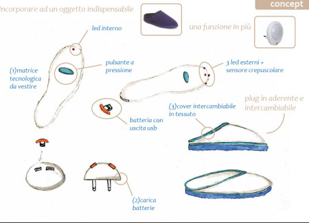 Così è nato il concept: una pantofola formata da due parti, una suola tecnologia in gomma e un “vestito” in cotone imbottito. La suola presenta tre LED frontali, un sensore crepuscolare (che attiva il circuito quando c’è scarsa luce) e una luce di individuazione (che rimane accesa quando il sensore crepuscolare dà il segnale; risulta utile per trovare sempre le pantofole, soprattutto quando è buio).