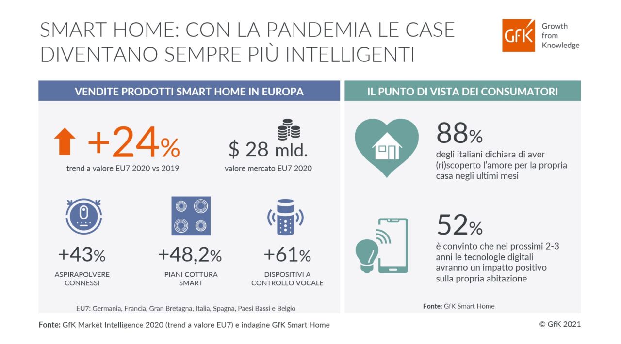 Nel corso del 2020 il segmento dei dispositivi smart per la casa è cresciuto del +24% per un controvalore pari a 28 miliardi di dollari nei 7 principali mercati europei . Lo stay-at-home forzato dalla pandemia ha spinto le vendite di sensori di allarme, robot aspirapolvere ed elettrodomestici smart per la cucina. Il 52% dei consumatori italiani è convinto che nei prossimi 2-3 anni le tecnologie digitali avranno un impatto positivo sulla propria casa. Ma resistono ancora delle barriere all’ingresso sulle quali le aziende devono intervenire per cogliere tutto potenziale della Smart Home. La pandemia da COVID-19 ha portato a una accelerazione della digitalizzazione dei consumatori, anche per quanto riguarda il modo di vivere la casa. Nel corso del 2020 GfK ha registrato un trend molto positivo per la Tecnologia di consumo e in particolare il segmento dei dispositivi smart per la casa è cresciuto del +24% per un controvalore pari a 28 miliardi di dollari nei 7 principali mercati europei (Germania, Francia, Gran Bretagna, Italia, Spagna, Paesi Bassi e Belgio).