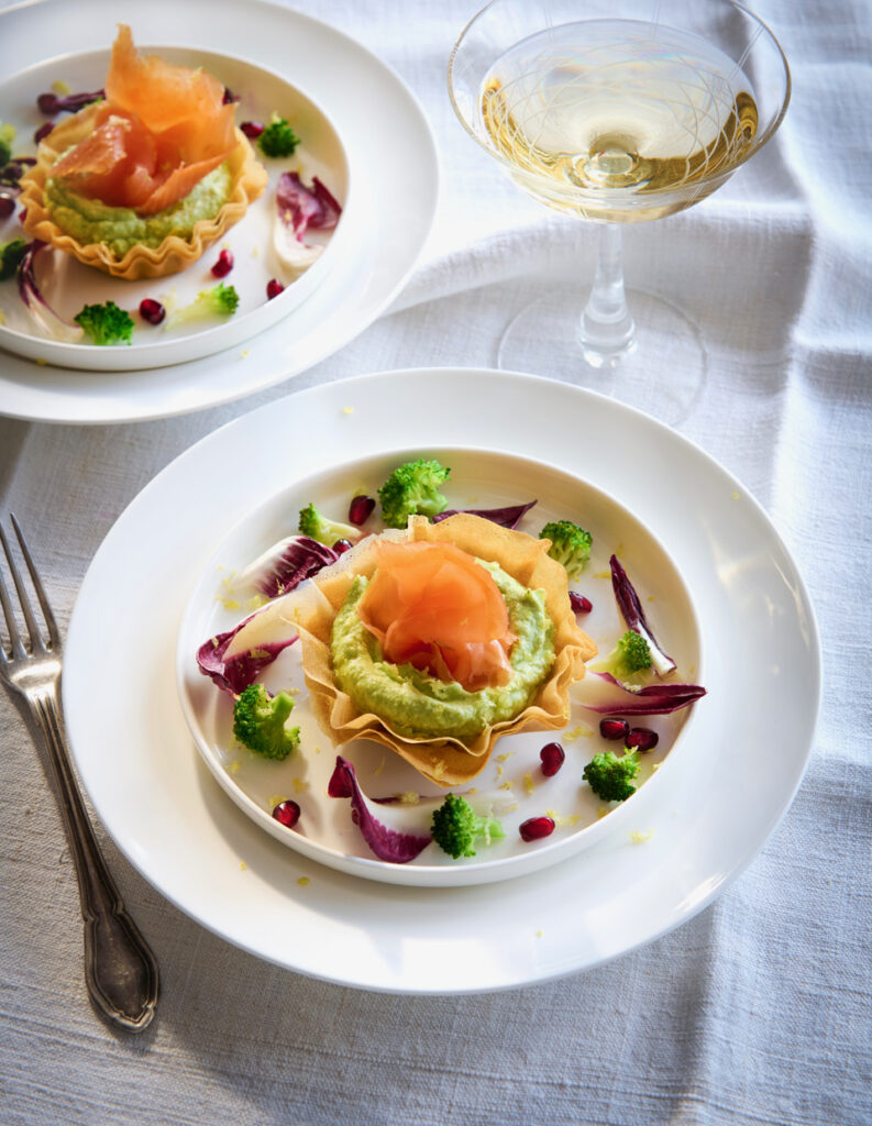 Al momento di portare in tavola, componete il piatto, distribuite la crema di broccoli nelle crostatine, adagiate le fette di salmone a modo di fiore, condite i ciuffetti di broccoletti rimasti con il radicchio di Verona, i chicchi di melagrana con un filo d’olio Evo e sale, e completate il piatto con il limone grattugiato.