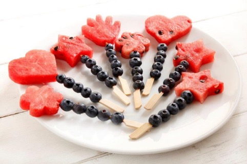 SPIEDINI DI ANGURIA E MIRTILLI SE CI SONO I NIPOTINI (visto e preso da “Il Cucchiaio d’Argento”). La ricetta non richiede la cottura e si prepara con pochi ingredienti e con attrezzi di facile reperibilità. In questa foto la versione che ha utilizzato alcune formine per biscotti – a stella, cuore, fiore e manina – ma si può intagliare l’anguria se c’è un nonno pronto a lavorare con fantasia, magari utilizzando gli stampi che avete già a casa.