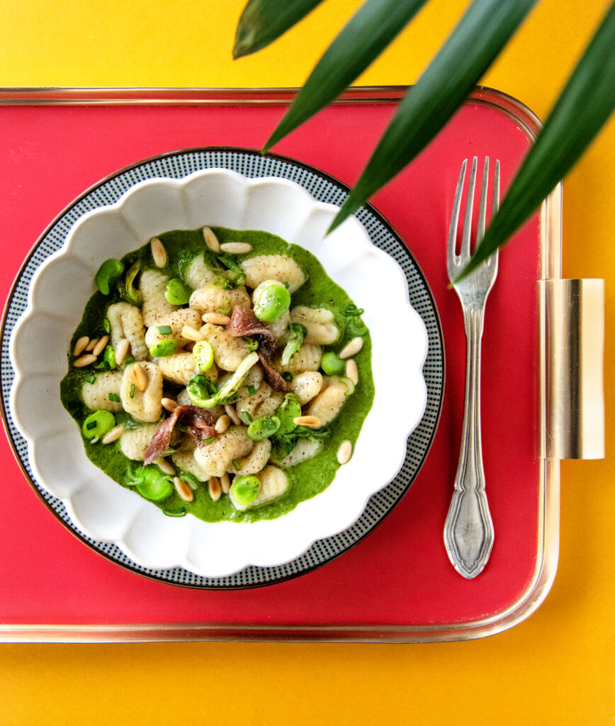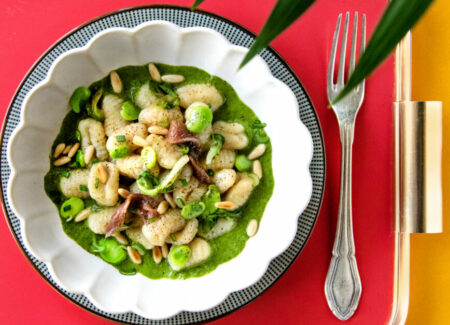 Riprendete la pentola d’acqua dove avete sbollentate le fave, portate l’acqua a bollore, salate e versate gli gnocchi di patate, ci vorrà un minuto; scolateli e versateli nella salsa di scarola, fateli saltare e serviteli con le favette croccanti, dei pezzetti di acciughe e i pinoli tostati.