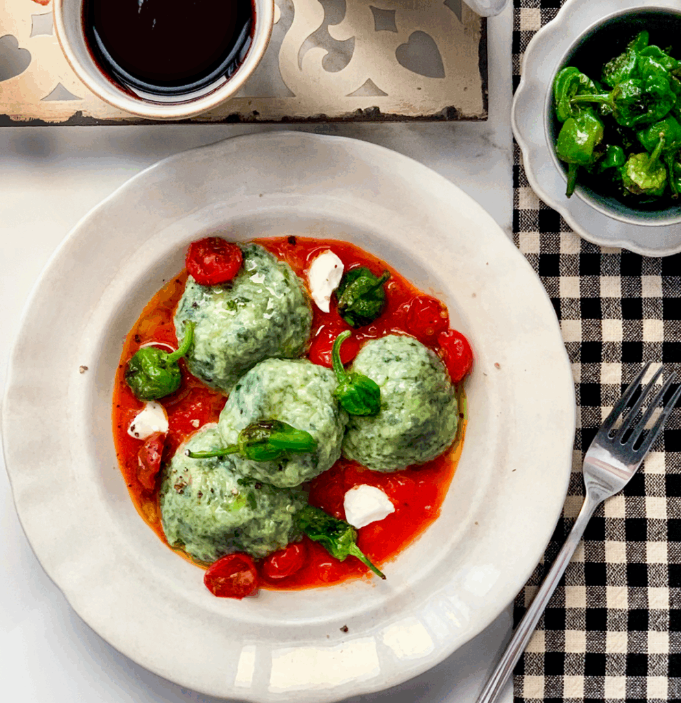 Portate una pentola d’acqua a bollore, spolverate con la farina un vassoio, aiutandovi con un cucchiaio fate dei mucchietti di gnudi sulla farina, circa 16, spolverate gli gnudi di altra farina e arrotolateli con le mani, quando l’acqua bolle, salatela e versateci gli gnudi che cuocerete per circa 4 minuti, scolateli e serviteli direttamente con la salsa di pomodoro, i pomodorini, i friggitelli e la panna acida, un filo d’olio. Buon appetito.