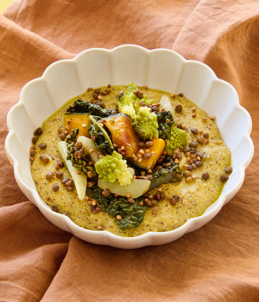 Topinambur 150 g, zucca Delica 200 g, cavolo romano 180 g, cavolo nero 150 g, polenta gialla 200 g, 80 g di farina di grano saraceno, 1,500 ml d’acqua, 120 g di lenticchie lessate, 40 g di grano saraceno in grani, timo, uno spicchio d’aglio, 1 arancia, olio Evo, sale e pepe.