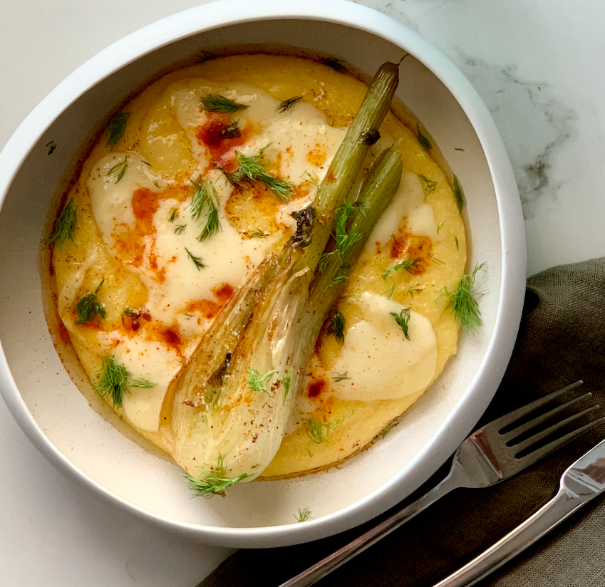 240 g di farina per polenta, 600 ml d’acqua, 600 ml di latte, sale, 120 g di fontina DOP, 2 finocchi, 40 g di burro, sale, paprika affumicata e pepe.
