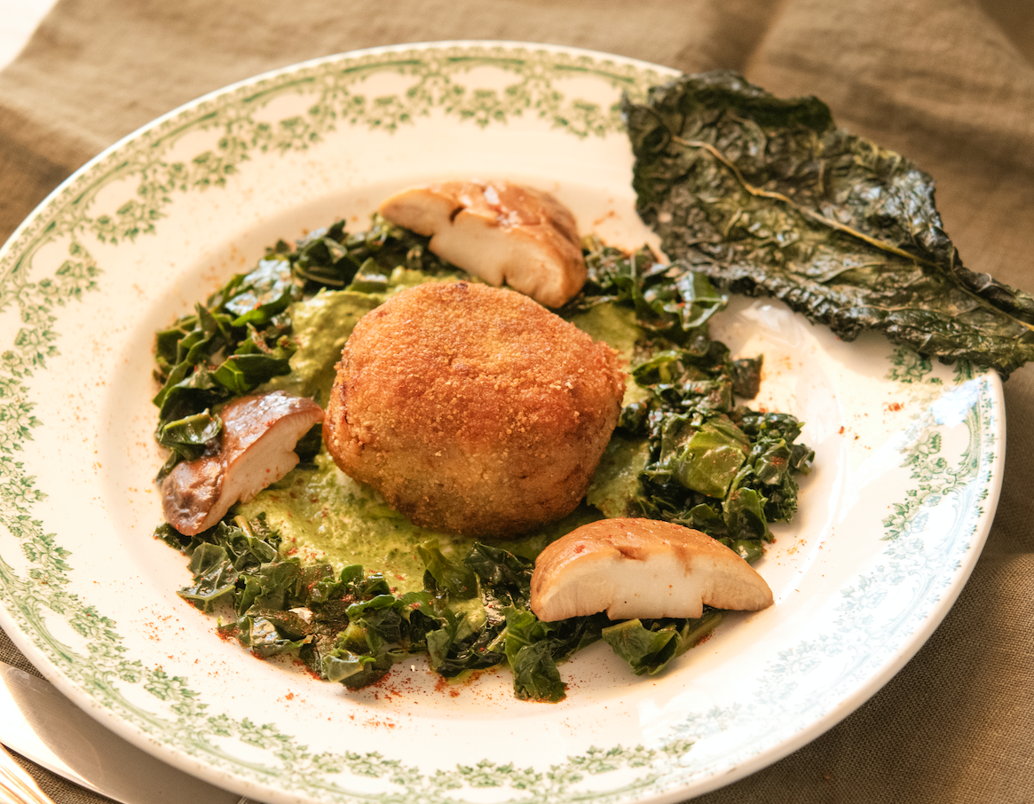 Friggete le polpette e servitele con la crema di cavolo nero, i porcini e il cavolo nero saltato, volendo un po’ di polvere di paprika affumicata.