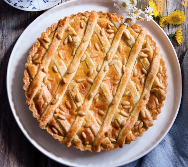 Stendete 2/3 della pasta frolla sulla spianatoia con un po’ di farina, adagiatela nello stampo, ritagliate il bordo, bucherellate dolcemente il fondo, versate la crema di semolino fredda, stendete l’altra parte di frolla rimasta e ritagliate 6 strisce larghe circa 1 cm, adagiatele sulla crostata, incrociando le strisce, cospargete sulla torta i pinoli messi da parte, passate sulle strisce un po’ di uovo sbattuto con una goccia di latte, potete aggiungere dei pezzetti di fragole o lamponi.