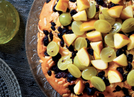 Tagliare a metà gli acini di uva (se non si trova l’uva spina, ottima anche uva settembrina) e la mela a dadini. Scaldare un velo di olio in padella, aggiungere l’uva e la mela e saltarle a fuoco vivace per 30 secondi; spolverizzarle con 1 cucchiaino di zucchero e una spruzzata di arancia e distribuirle sulla torta, una volta che si sarà raffreddata.