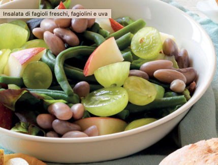 Lessare i borlotti in acqua bollente per 10-12’. Spegnere, salare e lasciare intiepidire nell’acqua di cottura. Mondare i fagiolini e lessarli per 7-8’. Tagliare la mela a fettine. Tagliare a metà gli acini di uva.