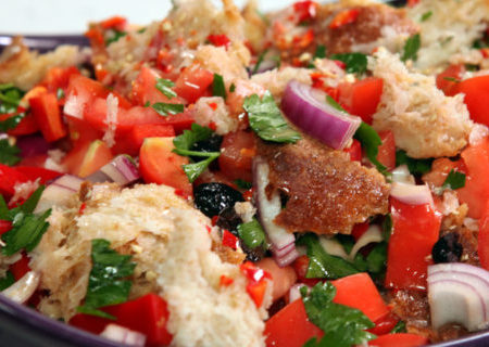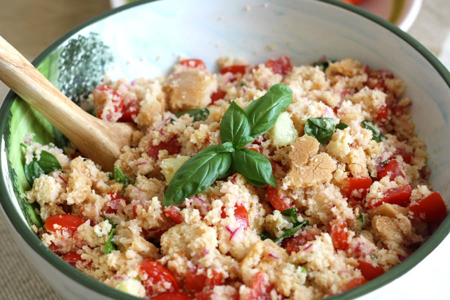 Piatto tipico della cucina toscana e, più in generale, dell’Italia centrale, la panzanella è una preparazione rustica a base di pane raffermo bagnato in acqua e poi strizzato, pomodori, cipolla e basilico, condita con olio, sale e aceto di vino bianco. Si tratta di un piatto povero, appartenente alla tradizione contadina, perfetto per l’estate in quanto non necessita di cottura e può essere preparato anche in anticipo. La ricetta originale prevede pane raffermo, cipolla rossa, basilico, il tutto condito con olio, aceto e sale. In Toscana e in Umbria il pane viene lasciato a bagno in acqua e poi strizzato fino a sbriciolarlo e spezzettarlo per mescolarlo agli altri ingredienti; nelle Marche le fette di pane raffermo vengono bagnate ma non sbriciolate e gli altri ingredienti posti sopra come si trattasse di una bruschetta. Nel tempo sono state introdotte varie aggiunte, alcune delle quali ormai riconosciute come canoniche, come il pomodoro crudo a pezzi e il cetriolo, altre più legate all’estro del cuoco, ad esempio olive speziate, uova sode a rotelle (si usano come guarnizione) e talvolta tonno.