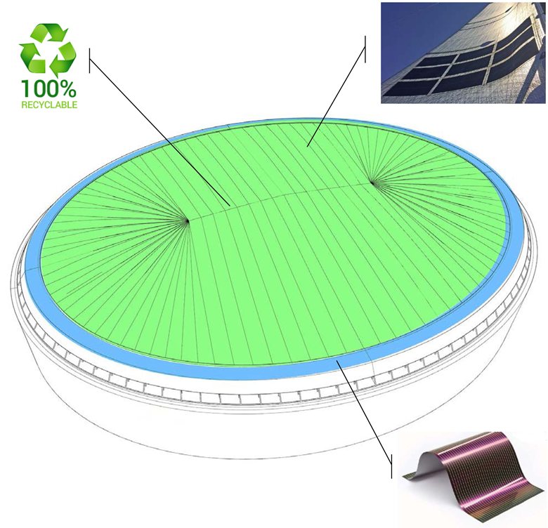 La soluzione prevede un anello perimetrale poggiato sul bordo superiore dell’Arena e permette di raccogliere i teli di copertura, disposti su un solo ordine di cavi, consentendo un rapido mutamento di assetto da aperto a chiuso.