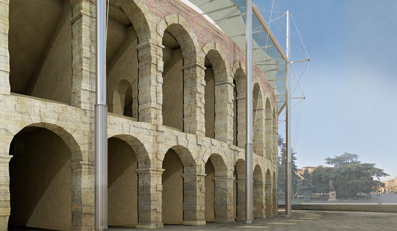 La copertura non altera i caratteri architettonici del monumento e l’anello strutturale posto in sommità richiama, verso l’interno un’idea di “portico sommitale”. Presenta una soluzione architettonica coerente con le strutture dell’Arena e definisce uno spazio appropriato nel rispetto della sua forma.