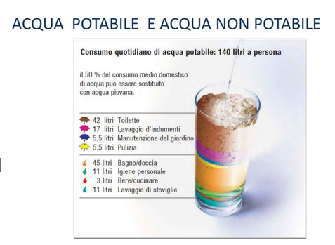 L’acqua è un bene molto prezioso, anche se forse è diventata un’abitudine: apriamo un rubinetto e ne possiamo avere quanta vogliamo. In realtà questo è vero solo in alcune parti del mondo, e anche in alcune zone d’Italia ci possono essere dei disagi, soprattutto in estate. Come è schematizzato nell’illustrazione sotto, che proviene dal sito del Comune di Latina, il consumo giornaliero di acqua potabile è uguale in media a 140 litri a persona! Normalmente, soprattutto in città, si utilizza sempre acqua potabile, quella dell’acquedotto, anche per usi per cui non sarebbe indispensabile. Poi ci sono quelli che non si fidano neppure dell’acquedotto e comperano l’acqua in bottiglia al supermercato… ma questo è un altro racconto. Qui vogliamo fare un po’ di considerazioni sull’uso dell’acqua piovana in agricoltura.