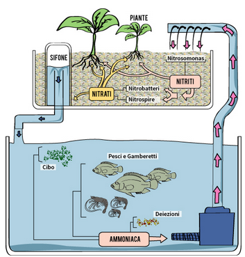 Un sistema anche più interessante per una piccola fattoria è la coltivazione acquaponica, che accoppia l’allevamento di pesci con la coltivazione di piante. Per applicarla, si deve capire, tra l’altro, quali specie di pesci o crostacei sono adatte alle condizioni locali della zona in cui la si vuole realizzare, quali vegetali possono essere coltivati in questo modo, e come si può gestire l’impianto durante la stagione fredda. Resta interessante la possibilità di accoppiarla alla raccolta dell’acqua piovana, e quella di utilizzare gli scarti della fattoria, oppure l’allevamento di insetti, per autoprodurre il mangime per i pesci. Con questa tecnica si ottiene un ambiente simbiotico tra ortaggi e pesci (o crostacei). I prodotti di scarto, costituiti principalmente da ammoniaca, sarebbero potenzialmente dannosi sia per le piante che per i pesci stessi; vengono filtrati e trasformati nitrati e nitriti, sostanze azotate utili per alimentare le piante. L’acqua ripulita viene prima inviata nel sistema di coltivazione, poi di nuovo nelle vasche dei pesci. Alle vasche ritorna circa il 90% dell’acqua iniziale, il restante è quella che viene assorbita dalle piante e deve essere periodicamente integrata. Il consumo di acqua perciò è molto minore di quello dell’agricoltura tradizionale.