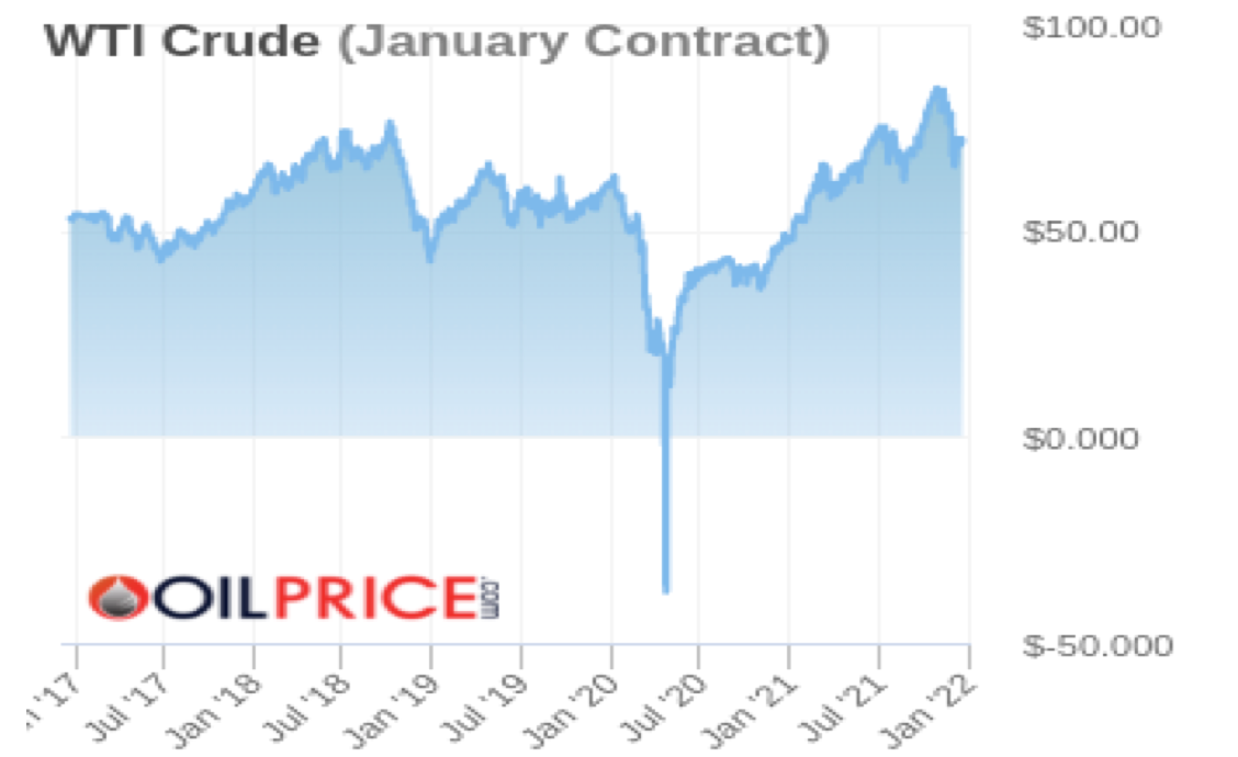 Cominciamo a guardare questo grafico dell’andamento del prezzo del petrolio negli ultimi 5 anni: